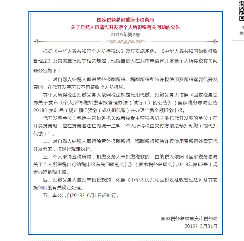 国家税务总局重庆市税务局关于自然人申请代开发票个人所得税有关问题的公告