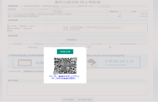 4、上传附件分为“电脑端上传”和“手机端扫码上传”两种方式,点击开始上传,完成后手动点击关闭上传,再点击“提交审批”即可。
