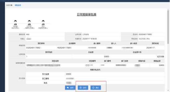 具体业务界面,显示报销单的具体内容,包括报销人上传的附件。审核报销单无误后,填写审批意见,输入签章密码,点击【通过】按钮完成审批。