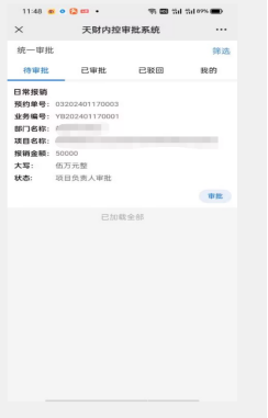 4、提交的单据会默认展示出来,也可在“待审单据”查找,选择需要审批的业务,点击该业务右方【审批】进入该业务页面。