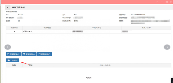 3、选择“提交线上审批”后,弹框将出现一个新的页面,里面有关于审批流程的信息,并且可以上传附件。如果审批角色及工号数据完整,可直接提交审批;如果出现角色旁边的工号(审批人工作证号)为空,如下图的业务分管校领导,请及时联系财务信息科(58102215)。