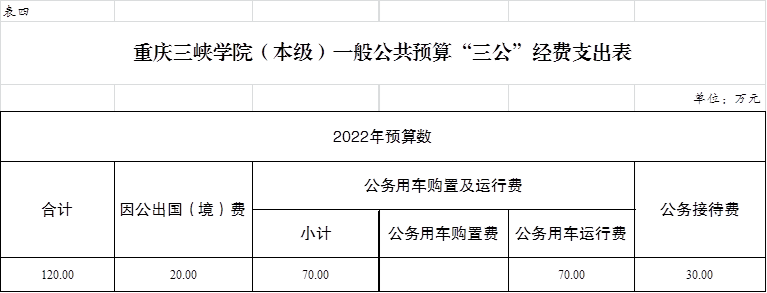 2022年“三公”经费预算120.00万元,比2021年减少50.00万元,其中:因公出国(境)费用20.00万元,比2021年减少30.00万元,主要原因是受新冠肺炎疫情影响,出国交流尽量转为线上交流,相应减少经费预算;公务接待费30.00万元,与2021年持平;公务用车运行维护费70.00万元,比2021年减少20.00万元,主要原因是厉行节约,加强公务用车管理,严控公务用车支出。