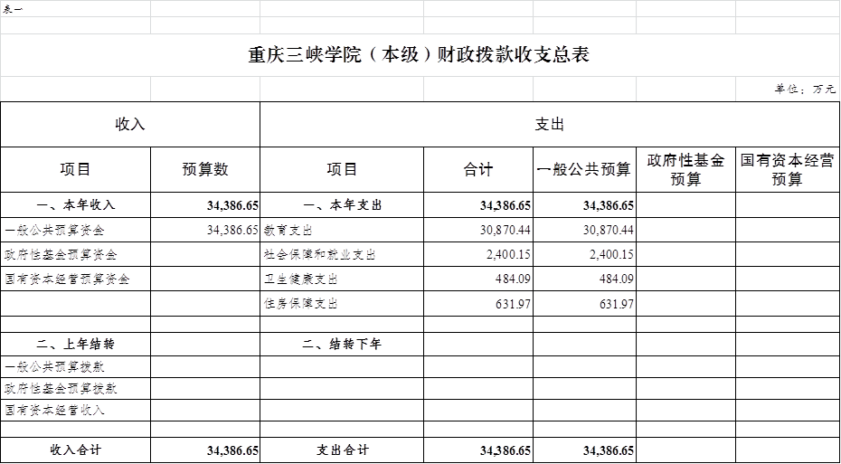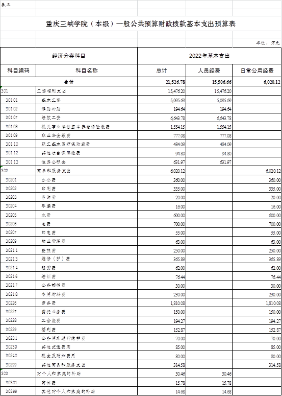 2022年一般公共预算财政拨款收入34386.65万元,一般公共预算财政拨款支出34386.65万元,比2021年增加1965.93万元。其中:基本支出21526.78万元,比2021年增加1376.05万元,主要原因是增人增资等因素导致工资福利支出增加2331.98万元、压缩一般性支出和后勤劳务外包导致商品和服务支出减少919.93万元、遗属人员生活补助纳入项目支出预算和离休补贴科目调整导致对个人和家庭的补助减少36.00万元,主要用于保障在职人员工资福利及社会保险缴费、离休人员离休费、退休人员补助等,保障单位正常运转的各项商品和服务支出;项目支出12859.87万元,比2021年增加589.88万元,主要原因是支出结构调整,编外教职工人员经费和遗属人员生活补助纳入了项目支出,主要用于党建和思想政治建设、学科专业(群)建设、人才队伍建设、高校科研建设经费、学生实践能力培养、高校学生资助经费等重点工作。