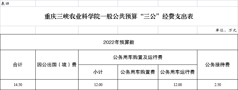 2022年“三公”经费预算14.50万元,比上年减少2.50万元,其中:因公出国(境)费用0万元,与上年持平;公务接待费2.50万元,比上年减少2.50万元,主要原因是厉行节约,打紧开支;公务用车运行维护费12.00万元,与上年持平;公务用车购置0万元,与上年持平。
